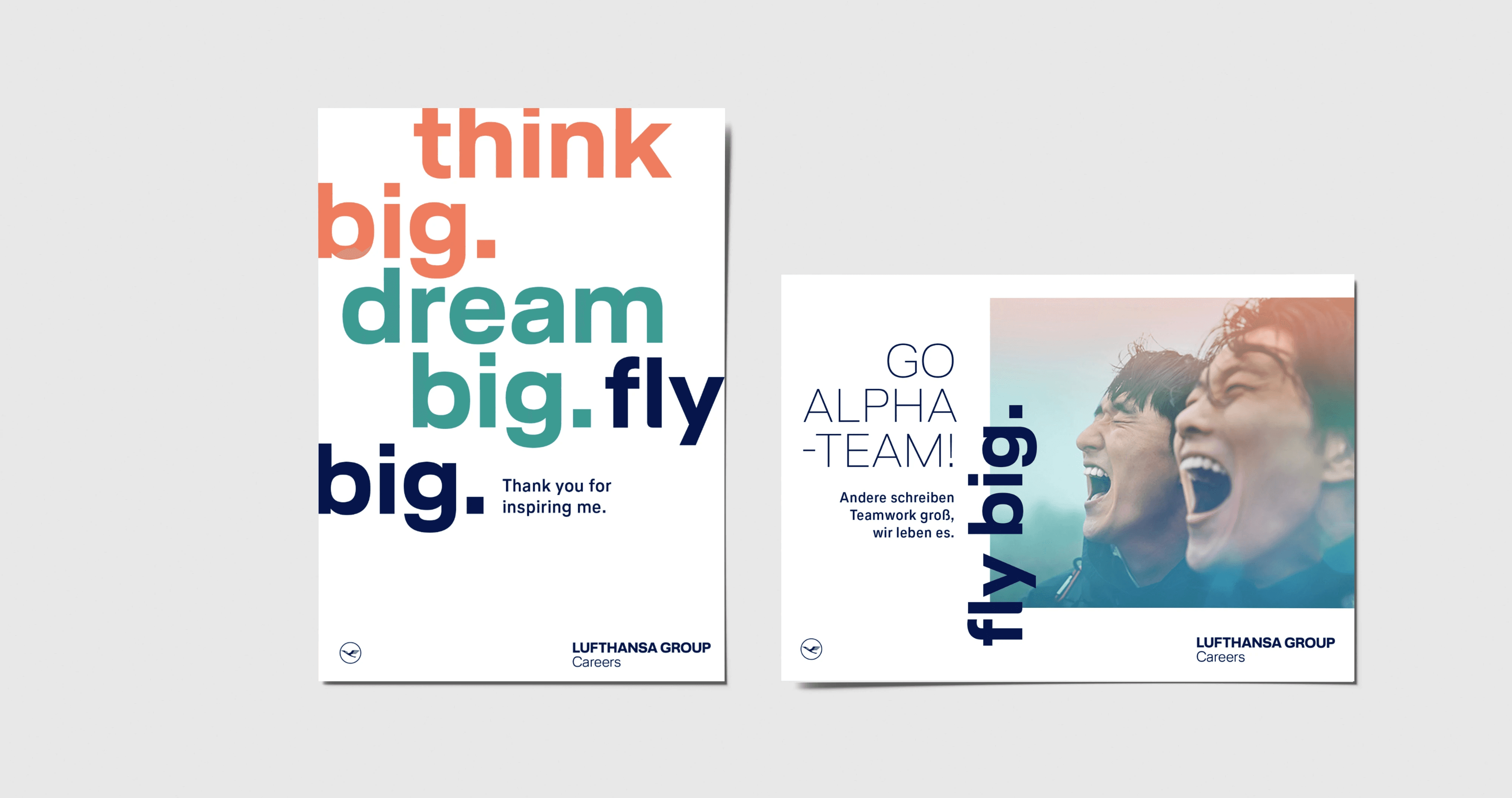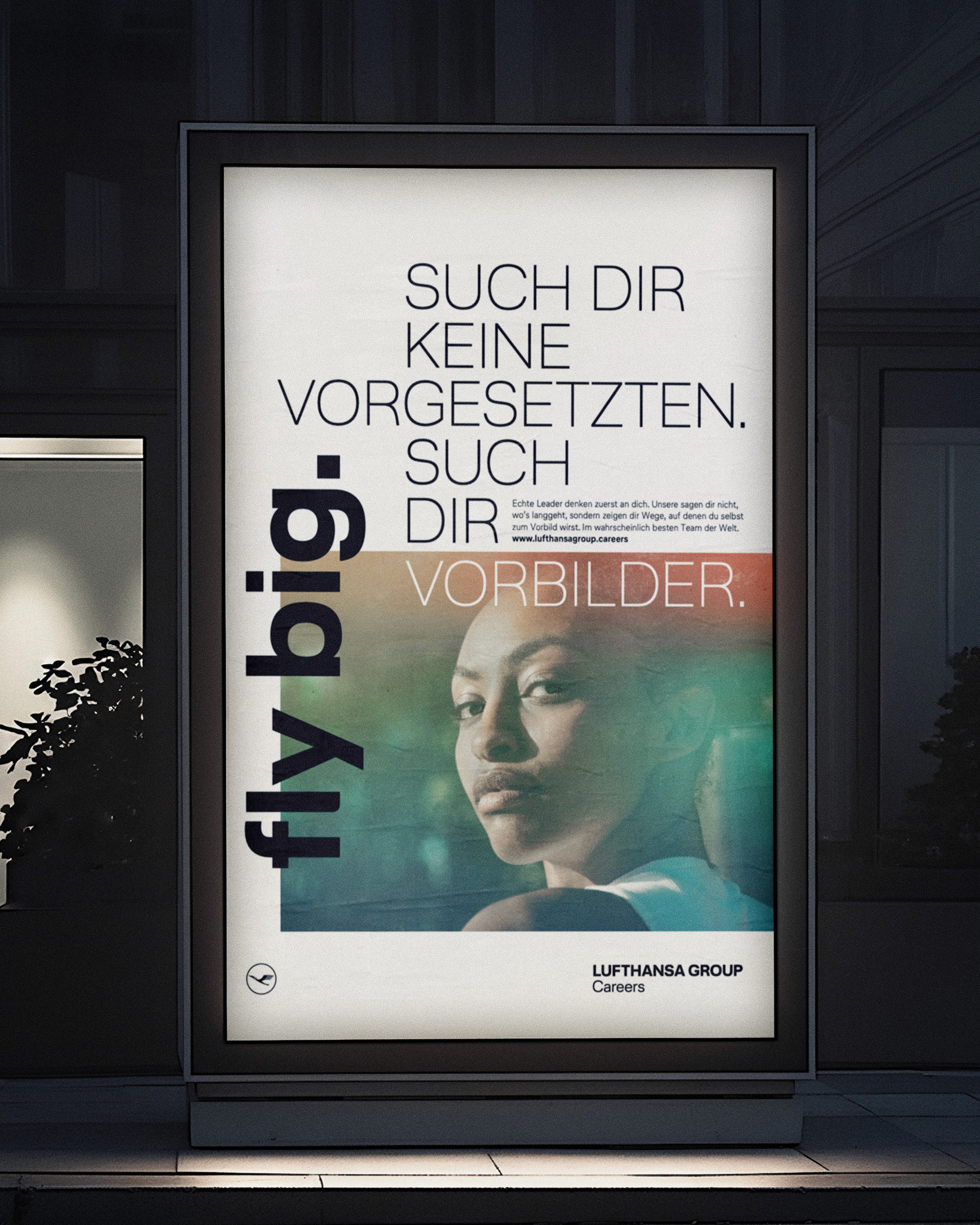 Für die Lufthansa Group entstand eine Employer-Branding-Kampagne, die die Vielfalt der Berufsbilder innerhalb des Konzerns sichtbar macht und neue Zielgruppen emotional anspricht. Ziel war es, die Lufthansa Group als moderne, internationale Arbeitgeberin zu positionieren und Karrierechancen klar und zeitgemäß zu kommunizieren. Im Rahmen des Projekts wurde ein flexibles visuelles System entwickelt, das sich kanalübergreifend einsetzen ließ – von digitalen und sozialen Medien über Print bis hin zu internen Anwendungen. Unter dem Leitmotiv „Fly Big.“ entstand eine dynamische Kampagne, die gezielt auf unterschiedliche Bereiche wie IT, Aviation oder Nachwuchstalente zugeschnitten werden konnte, ohne an Wiedererkennbarkeit zu verlieren.